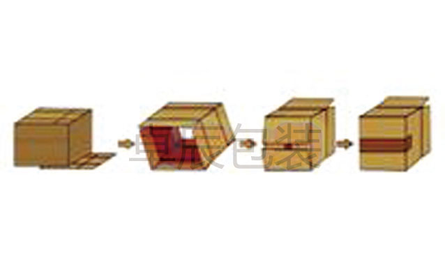 膠帶粘貼,將疊成紙板的箱板自動(dòng)打開(kāi),箱子底部按一定程序折